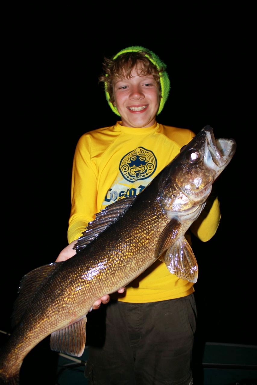 KAI WITH THIS GINORMOUS WALLEYE HE CAUGHT THE FIRST NIGHT IN CAMP RIGHT OFF THE DOCK. THIS IS HIS LARGEST WALLEYE EVER.